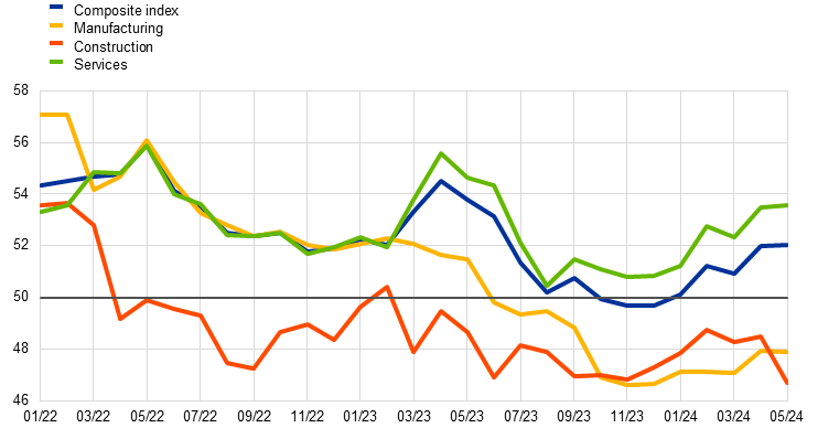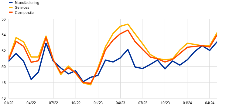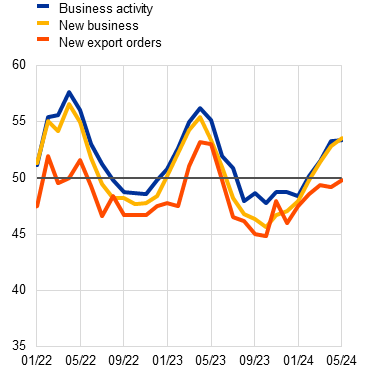 Short-term labour market indicators continue to point to employment growth in the second quarter of 2024. The monthly composite PMI employment indicator rose from 52.0 in April to 52.1 in May, suggesting an increase in employment. This indicator had declined substantially from its peak of April 2023, but has edged up again in the last few months, driven by the services sector (Chart 6, panel b). The PMI services indicator increased from 53.5 in April to 53.6 in May. By contrast, the PMI manufacturing indicator remained in contractionary territory.