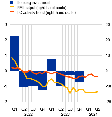 Notes: Lines indicate monthly developments, while bars refer to quarterly data. The PMIs are expressed in terms of the deviation from 50. In panel a), business investment is measured by non-construction investment excluding Irish intangibles. PMI lines refer to responses from the capital goods sector. ”Sentiment ahead” refers to the six-month ahead sub-index of the euro area Sentix Investor sentiment indicator (rescaled by a factor of three). The latest observations are for the fourth quarter of 2023 for business investment, May 2024 for the Sentix index and April 2024 for all other items. In panel b), the line for the European Commission’s activity trend indicator refers to the weighted average of the building and specialised construction sectors’ assessment of the trend in activity compared with the preceding three months, rescaled to have the same standard deviation as the PMI. The line for PMI output refers to housing activity. The latest observations are for the fourth quarter of 2023 for housing investment, and May 2024 for PMI output and the European Commission’s activity trend.