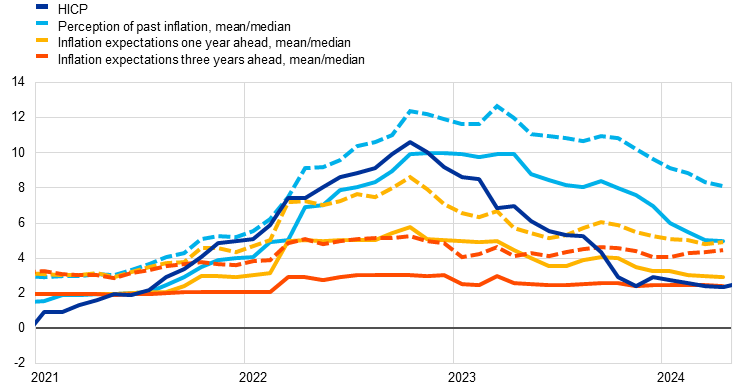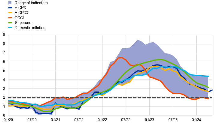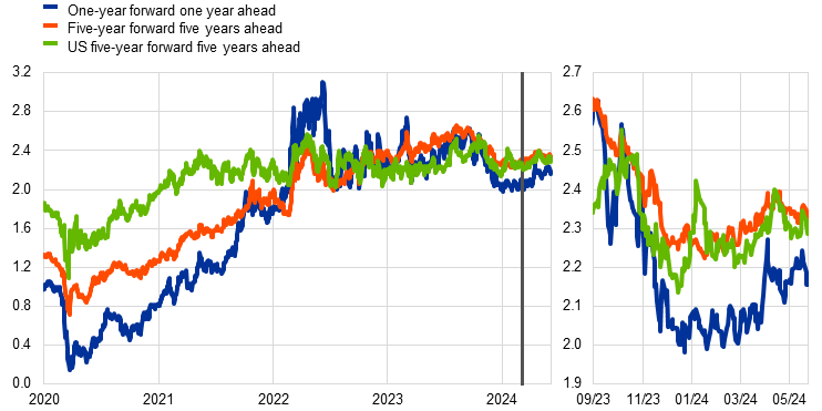 Most measures of underlying inflation declined further in April, the last month for which data were available, confirming the picture of gradually diminishing price pressures. However, domestic inflation remains high. Wages are still rising at an elevated pace, making up for the past inflation surge. Owing to the staggered nature of the wage adjustment process and the important role of one-off payments, labour costs will likely fluctuate over the near term, as seen in the pick-up in negotiated wages in the first quarter. At the same time, forward-looking indicators signal that wage growth will moderate over the course of the year. Profits are absorbing part of the pronounced rise in unit labour costs, which reduces its inflationary effects. Measures of longer-term inflation expectations have remained broadly stable, with most standing at around 2%.