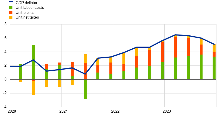 10. The cut-off date for data included in this issue of the Economic Bulletin was 5 June 2024. National accounts data released on 7 June 2024 saw stronger annual growth in compensation per employee in the first quarter of 2024 (5.0% after 4.9% in the fourth quarter) and lower annual growth in unit labour costs (5.7% after 6.0% in the fourth quarter). The annual growth rate of the GDP deflator decreased further to 3.6% in the first quarter of 2024, down from 5.1% in the fourth quarter of 2023.