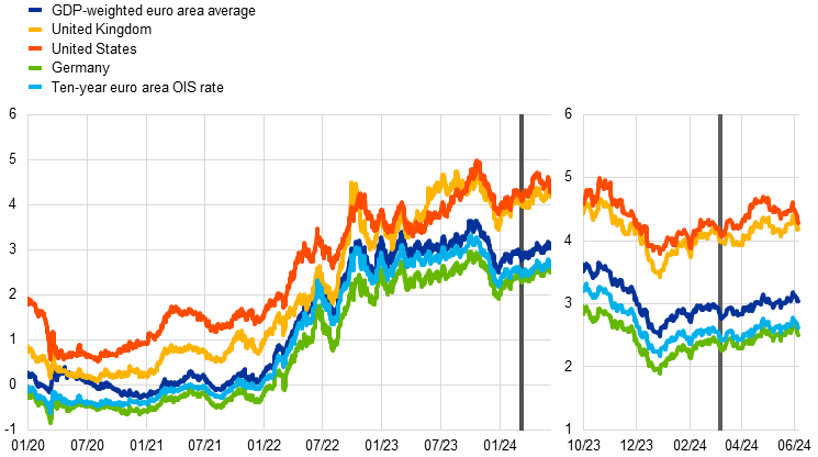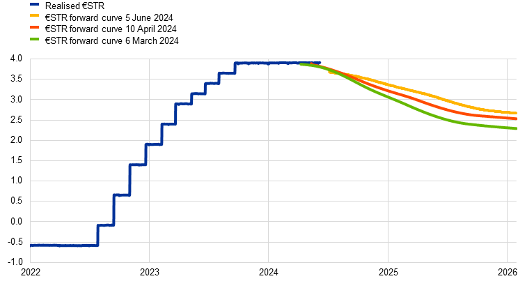 In the United States, continued robust economic activity and persistent inflation led the Federal Open Market Committee to delay its first rate cut. Real GDP growth slowed in the first quarter of 2024 to 0.3%, down from 0.5% in the fourth quarter of last year. However, domestic demand remained solid, as the negative net trade contribution reflected a large increase in imports. Real disposable income growth slowed and the savings rate fell further in the first quarter. Available estimates based on high-frequency data suggest that real GDP growth may increase slightly in the second quarter of 2024 but remain below the pace of growth recorded in the second half of 2023. Although remaining very tight, the US labour market continues to show some signs of cooling. While non-farm employment increased in April, it was markedly below the average observed in the first quarter of 2024 and the unemployment rate increased slightly. Both the vacancy-to-unemployed ratio and wage growth remain high but they are declining, albeit only slowly. Consumer price inflation declined slightly in April, with its headline and core inflation measures standing at 3.4% and 3.6% respectively.[3] Looking ahead, inflation is expected to slowly decline further but remain above the Federal Reserve’s target of 2% for an extended period. Against this macroeconomic backdrop, the Federal Open Market Committee has recently emphasised in its communications that interest rates will remain “high for longer”.