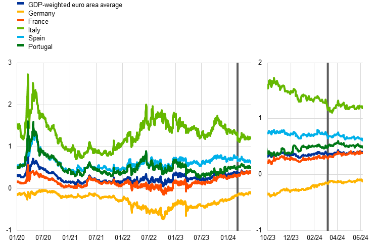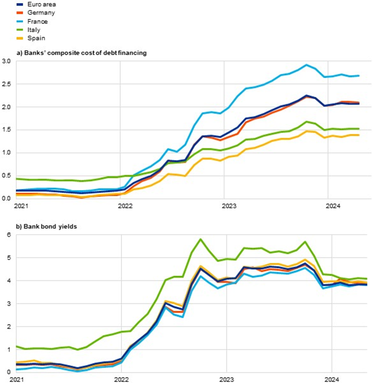 13. Owing to lags in data availability for the cost of borrowing from banks, data on the overall cost of financing for NFCs are only available up to April 2024.