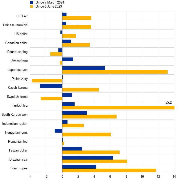 As for commodity prices, European gas and food prices have increased since the last Governing Council meeting, while oil prices have declined. Although European gas prices have increased, these remain low compared with the levels observed after Russia’s invasion of Ukraine. Higher gas prices reflect supply disruptions relating to liquefied natural gas exports from the United States and Qatar, extended pipeline maintenance in Norway and to Russian attacks on Ukrainian gas storage facilities. Crude oil prices declined, as the tensions in the Middle East continued to have only short-lived effects on oil prices, with the global oil supply remaining largely unaffected. Moreover, lower-than-expected global oil demand counteracted the impact of the reduced oil supply and the supply risks on prices. The International Energy Agency forecasts a modest global oil supply deficit in 2024 and 2025, but the buffers needed to absorb further shocks seem to be larger than they were before Russia’s invasion of Ukraine. Risks to oil prices remain tilted to the upside, particularly if tensions in the Middle East were to escalate. Food commodity prices increased significantly, largely reflecting developments in cocoa prices amid severe supply disruptions in West Africa. Cocoa prices have recently declined from the peaks observed in late April 2024 but remain volatile. Grains prices increased due to adverse supply developments.