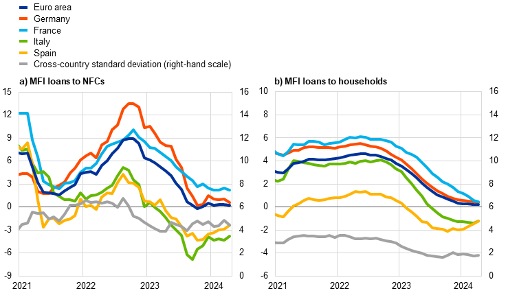 Notes: Loans from monetary financial institutions (MFIs) are adjusted for loan sales and securitisation; in the case of non-financial corporations (NFCs), loans are also adjusted for notional cash pooling. The cross-country standard deviation is calculated using a fixed sample of 12 euro area countries. The latest observations are for April 2024.