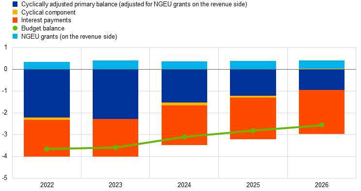 According to the June 2024 Eurosystem staff macroeconomic projections, the euro area general government budget balance will improve moderately over the projection horizon (Chart 26).[15] Looking back, the euro area budget deficit declined very marginally from 3.7% in 2022 to 3.6% of GDP in 2023. Looking forward, the deficit should decline more significantly to 3.1% of GDP in 2024 and then further to 2.8% of GDP in 2025 and to 2.6% of GDP in 2026. The projected path mainly reflects a gradually shrinking but still negative cyclically adjusted primary balance over the forecast horizon, with the largest reduction occurring in 2024. This impact will, however, be partly compensated by gradually increasing interest expenditures over the whole period, reflecting a slow pass-through of past interest rate increases given long sovereign debt residual maturities. The significant fall in the cyclically adjusted primary deficit in 2024 is largely driven by the significant scaling back of government fiscal support measures as the energy shock and high overall consumer price inflation fades.