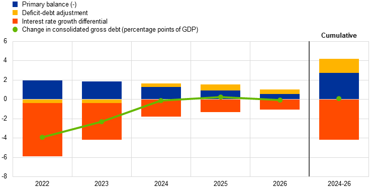 According to the June 2024 Eurosystem staff macroeconomic projections, the euro area general government budget deficit, which stood at 3.6% of GDP in 2023, should decline to 3.1% of GDP in 2024 and then fall gradually to 2.8 in 2025 and 2.6% in 2026. The euro area fiscal stance is projected to tighten significantly in 2024 and somewhat further in the subsequent two years. The tightening in 2024 mostly reflects expectations that governments will largely phase out their energy and inflation-related support measures. This factor will also marginally contribute to the tightening of the fiscal stance in 2025, while somewhat slower expenditure growth and additional consolidation measures on the revenue side in some countries add to the projected slight additional tightening over 2025-2026. The euro area debt-to-GDP ratio is projected to broadly stabilise at an elevated level of around 89% as a result of continued primary deficits and positive deficit-debt adjustments compensated by shrinking but still negative interest rate-growth differentials. It will now be important for governments to implement the EU’s revised economic governance framework fully and without delay to bring down budget deficits and debt ratios on a sustained basis. At the same time, an effective and rapid implementation of the Next Generation EU (NGEU) programme is crucial in fostering innovation and increasing investment in the green and digital transitions.