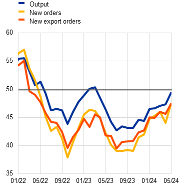 Survey data point to a continued services-led expansion in the second quarter of 2024. The composite output Purchasing Managers’ Index (PMI) stood at 51.9 on average in April and May, up from 49.2 in the first quarter of 2024. The index, which is now indicating positive growth, is thus continuing its upward movement that started in October 2023. Across sectors, the PMI for manufacturing output remained in contractionary territory in May, having increased steadily from the summer of 2023 (Chart 5, panel a). The new orders index, which should be more forward looking, has shown a similar, albeit somewhat stronger, improvement. Overall, these indicators suggest that the fall in activity in the manufacturing sector is bottoming out. The recovery of activity in the services sector has been more pronounced, suggesting that the second-quarter outcome will also be characterised by a services-led expansion (Chart 5, panel b). The assessment for the second quarter is corroborated by the evidence provided in Box 2, which shows that demand and supply sentiment have largely normalised since 2022, based on corporate earnings calls. At the same time, risk sentiment has receded somewhat, while remaining elevated by historical standards.