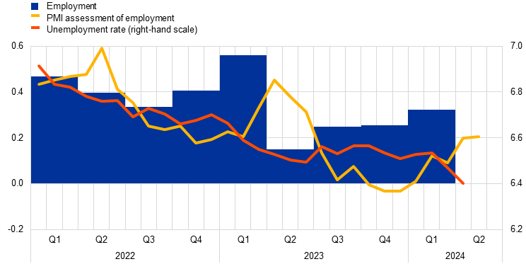 Notes: In panel a), the two lines indicate monthly developments, while the bars show quarterly data. The PMI is expressed in terms of the deviation from 50, then divided by 10 to gauge the quarter-on-quarter employment growth. The latest observations are for the first quarter of 2024 for employment, May 2024 for the PMI assessment of employment and April 2024 for the unemployment rate. In panel b), the latest observations are for May 2024 for all items.