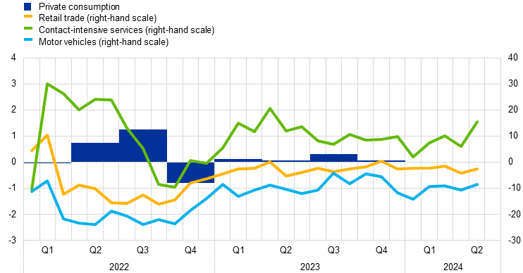 Notes: Business expectations for retail trade (excluding motor vehicles), expected demand for contact-intensive services and expected sales of motor vehicles for the next three months refer to net percentage balances; “contact-intensive services” refers to accommodation, travel and food services. The latest observations are for the fourth quarter of 2023 for private consumption and May 2024 for business expectations for retail trade, contact-intensive services and motor vehicles.