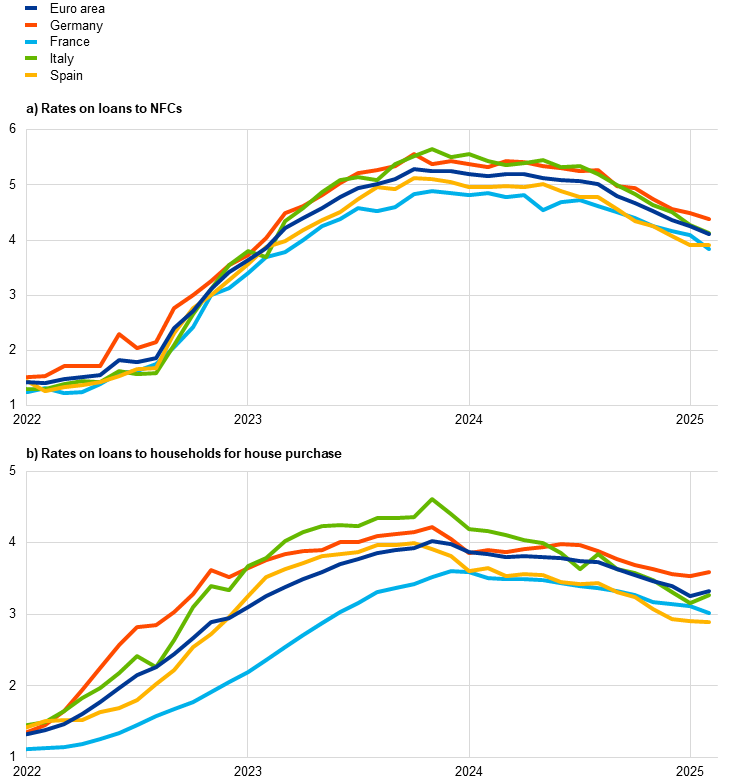 Notes: NFCs stands for non-financial corporations. Composite bank lending rates are calculated by aggregating short and long-term rates using a 24-month moving average of new business volumes. The latest observations are for February 2025.