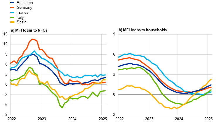 Notes: Loans from monetary financial institutions (MFIs) are adjusted for loan sales and securitisation; in the case of non-financial corporations (NFCs), loans are also adjusted for notional cash pooling. The latest observations are for February 2025.
