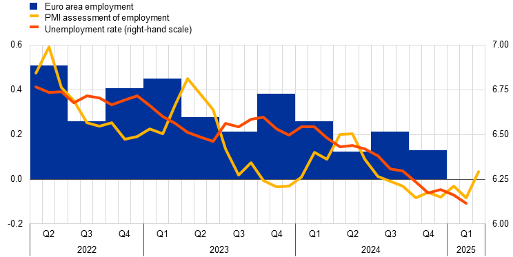 Notes: The two lines indicate monthly developments, while the bars show quarterly data. The PMI is expressed in terms of the deviation from 50, then divided by ten. The latest observations are for the fourth quarter of 2024 for employment, for March 2025 for the PMI assessment of employment and for February 2025 for the unemployment rate.