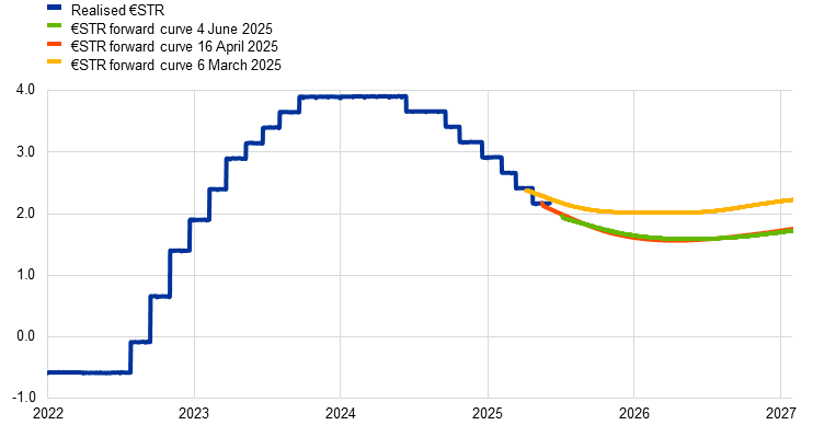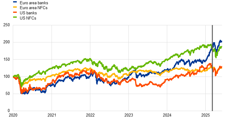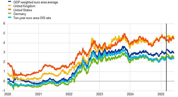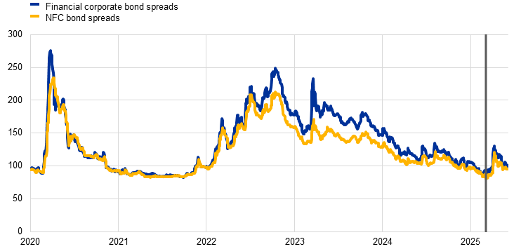 Risk-free interest rates have remained broadly unchanged since the Governing Council’s monetary policy meeting on 17 April 2025. Equity prices have risen, and corporate bond spreads have narrowed, in response to more positive news about global trade policies and the improvement in global risk sentiment.