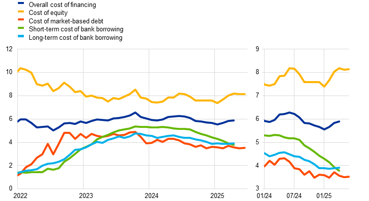 Owing to lags in data availability for the cost of borrowing from banks, data on the overall cost of financing for NFCs are only available up to April 2025.