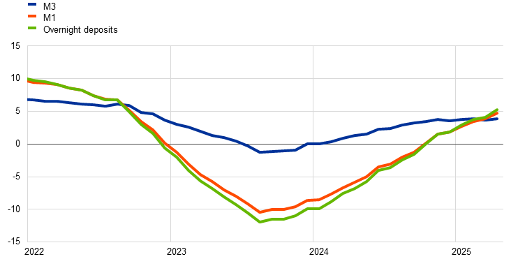 Growth in broad money (M3) picked up in April 2025, driven by overnight deposits and inflows from abroad in a context of high uncertainty (Chart 23). Annual M3 growth rose to 3.9% in April, up from 3.7% in March, supported by a moderately strong monthly inflow over the course of the month. Annual growth of narrow money (M1), which comprises the most liquid assets of M3, increased significantly to 4.7% in April, up from 3.9% in March. With regard to the individual components, the increase in M3 in April was driven by inflows into overnight deposits and, to a lesser extent, by repurchase agreements held by firms and institutional investors. The annual growth rate of overnight deposits held by firms and households rose to 5.3% in April, up from 4.1% in March, reflecting a strong preference for liquidity by investors amid volatility in an uncertain environment and lower interest rates on savings deposits. This partly offset the weakening in time deposits, explaining the contrasting dynamics in M1 and M3. With regard to the various counterparts, the recovery in M3 growth was driven by net foreign inflows. However, the figure for April was overestimated because of special factors – unrelated to US tariff announcements – which had boosted government deposits, with the underlying inflows likely to have been more moderate. Bank lending to firms and households continued to contribute positively to money creation in April. While the ongoing contraction of the Eurosystem balance sheet continued to contribute negatively to M3 growth, robust net purchases of government securities by banks helped to offset this impact.