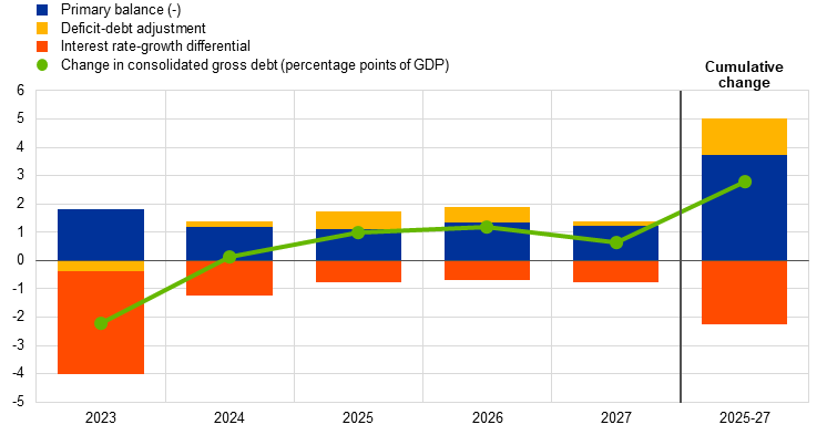 The euro area debt-to-GDP ratio is seen as being on an increasing path over the projection horizon, rising to above 90% of GDP in 2027 (Chart 25). During the COVID-19 pandemic, the euro area debt-to-GDP ratio rose significantly, to around 97% in 2020, but fell gradually thereafter. However, since 2023 it has been following an upward trend, reaching 87.5% in 2024, with the lowest debt-to-GDP ratio in Estonia (23.6%) and the highest in Greece (153.6%). It is projected to increase further to 90.3% in 2027, driven by primary deficits and, in some countries, sizeable deficit-debt adjustments.