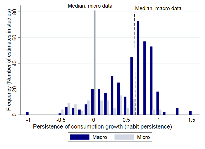 Note: Reproduced from Havranek, Rusnak, and Sokolova (2017), Figure 2. The figure shows the distribution of 597 estimates of persistence in consumption growth or “habit persistence” in studies based on macro and micro data. Solid and dashed lines show the median estimates in micro (0.0) and macro (0.6) studies, respectively.