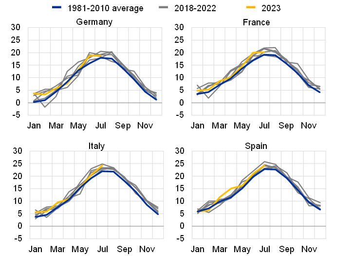 We analyse the impact of temperature shocks on inflation, assessing (i) the four largest euro area economies; (ii) the main inflation aggregates; and (iii) differences across seasons of the year. The temperature shocks are defined as the deviation of monthly mean temperatures from their historical average (as recorded over the period 1981-2010).[2] Notably, the data reveal that in recent years temperatures have often increased above the historical average (Chart 1).