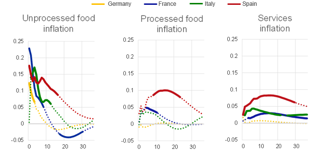 We find that when the shock occurs in the summer, temperature increases lead to significant upward impacts on unprocessed food inflation in all four economies. When the monthly mean temperature increases by 1°C, unprocessed food inflation rises by around 0.1-0.2 percentage points within the first year after the shock hits (Chart 2). The effects are larger and more persistent in France, Italy, and Spain than in Germany. Potential channels for these impacts include decreases in agricultural productivity, labour productivity and the supply of fresh food. The response to a shock that occurs in winter or spring is less significant and can conversely lead to a fall in inflation, though the effect is usually less persistent than when the shock occurs in summer. Higher summer temperatures also result in an increase in processed food inflation in France and Spain, though with some lag. This may reflect a delayed pass-through of a rise in food commodity prices to processed food prices.