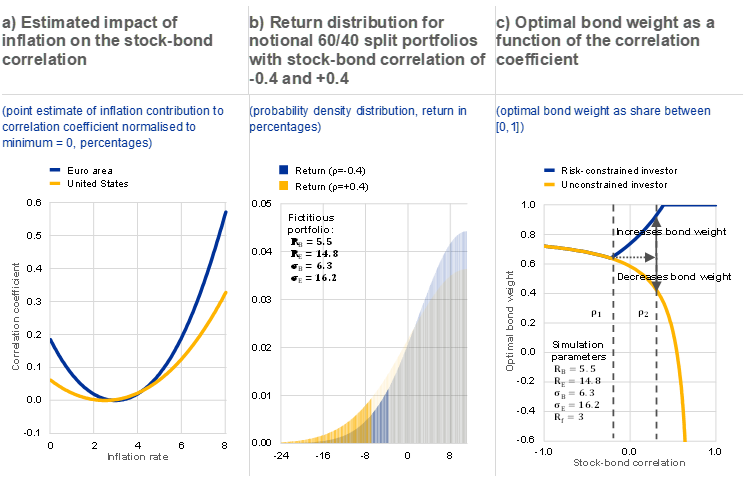 Notes: Panel a: the model used builds on Andersson et al.* In line with this paper, risk appetite (or “flight-to-safety behaviour”) is proxied by the VSTOXX. A decline in risk appetite (increase in VSTOXX) is found to be associated with a lower stock-bond correlation. Instead of GDP, consumer confidence is included to proxy real growth dynamics. In addition, the inflation rate is included both linearly and quadratically, allowing non-linear dynamics to be captured. The empirical analysis is based on monthly data. The model uses simple (robust) Ordinary Least Squares (OLS) estimators and maps the regressors to the interval [-1,1] by means of an adjusted sigmoid function similar to that in Andersson et al., where The parameter estimates and their standard errors for and are given by -0.283 with standard error of 0.062 and with standard error of 0.009 for the euro area. Estimates are based on monthly data from 1 January 2000 to 30 September 2022. Panels b and c: parameters are given as percentages, where and stand for stock return and volatility, and and for bond return and volatility. stands for the risk-free rate. Panel c: risk-constrained investors are required to limit their maximum expected portfolio return volatility to . Both investor types (constrained and non-constrained) optimise their expected risk-adjusted return, defined as the ratio of the portfolio’s excess return to volatility. A number of assumptions have been made for the parameter values but, in qualitative terms, the main results of the simulation presented hold for a wide range of parameters.