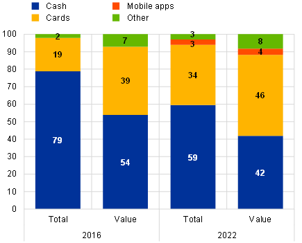 a) Share of transactions in the euro area, by means of payment