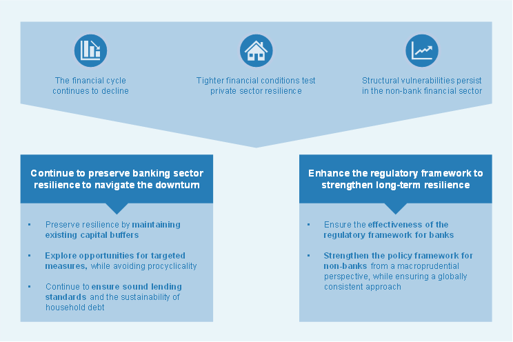 Against this backdrop, three key themes shape the outlook for euro area financial stability. First, markets and non-banks remain highly vulnerable to adverse macro-financial and geopolitical surprises and associated shifts in market sentiment. Second, tighter financial and credit conditions are increasingly translating into higher debt service costs, weakening the resilience of firms, households and sovereigns. Third, growing vulnerabilities in the real economy can be expected to gradually impair banks’ asset quality, and this, together with lower lending volumes and rising funding costs, may challenge their profitability outlook.