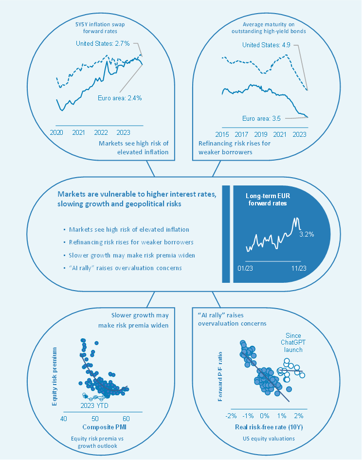 Despite such risks, financial markets have remained resilient. This strength reflects expectations of a soft landing, with limited impacts on economic growth as inflation recedes to moderate levels. Sentiment could shift quickly if actual outturns were to deviate from this benign scenario, and disorderly adjustments could be amplified by non-bank financial institutions with elevated credit and liquidity risks. An escalation of the conflict in the Middle East could trigger a sharp increase in risk aversion in financial markets, unravelling the prevailing vulnerabilities. In addition to the potential adverse repercussions for the supply of energy commodities, an escalation could undermine general confidence and slow down economic growth, while pushing inflation rates up in parallel.