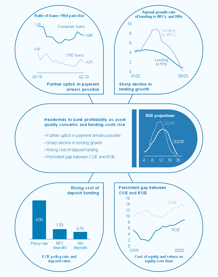Tighter financing conditions have reduced the affordability of and demand for real estate assets, putting downward pressure on prices. They have also increased the debt service costs faced by existing borrowers, with more-indebted borrowers in countries with widespread variable-rate lending being the most affected. Robust labour markets have thus far supported household balance sheets, thereby mitigating credit risk in banks’ relatively large residential real estate exposures. Commercial real estate firms, by contrast, have faced more severe challenges in a context of rising financing costs and declining profitability. While banks have smaller exposures to commercial real estate markets, losses in this segment could act as an amplifying factor in the event of a wider shock.