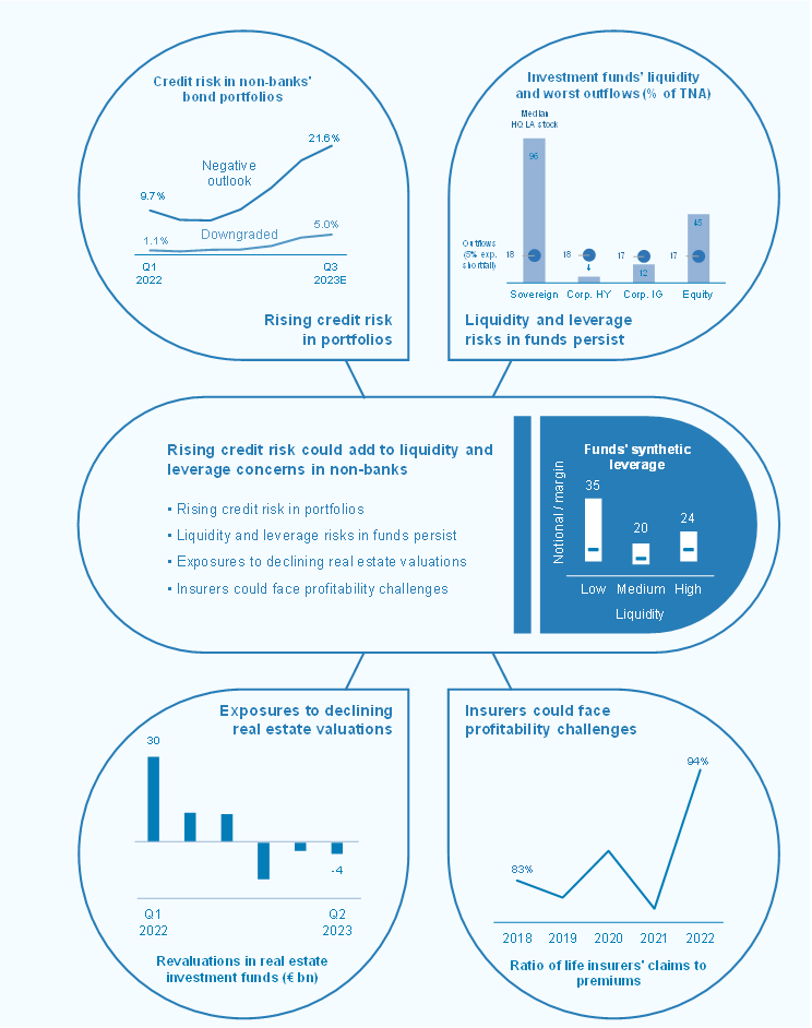 Non-banks continue to face high credit risks, despite some rebalancing of their investment portfolios towards safer assets. As of mid-2023 cumulative purchases of investment-grade sovereign and corporate debt by the non-bank financial intermediation (NBFI) sector over one year have been close to the record highs observed during the post-pandemic recovery (Section 4.1). Shifts by investors towards safer fund types helped mitigate aggregate credit risk in the sector thanks to reduced incentives to search for yield. That said, high economic uncertainty and tighter financial conditions have contributed to a deteriorating credit outlook for several issuers, exposing the NBFI sector to possible revaluation losses stemming from downgrades and an increase in default risk. In particular, some non-banks remain heavily exposed to interest rate-sensitive sectors, such as highly indebted corporates and real estate. Deteriorating corporate fundamentals and the ongoing correction in real estate markets could expose non-banks investing in these sectors to revaluation losses and investor outflows.