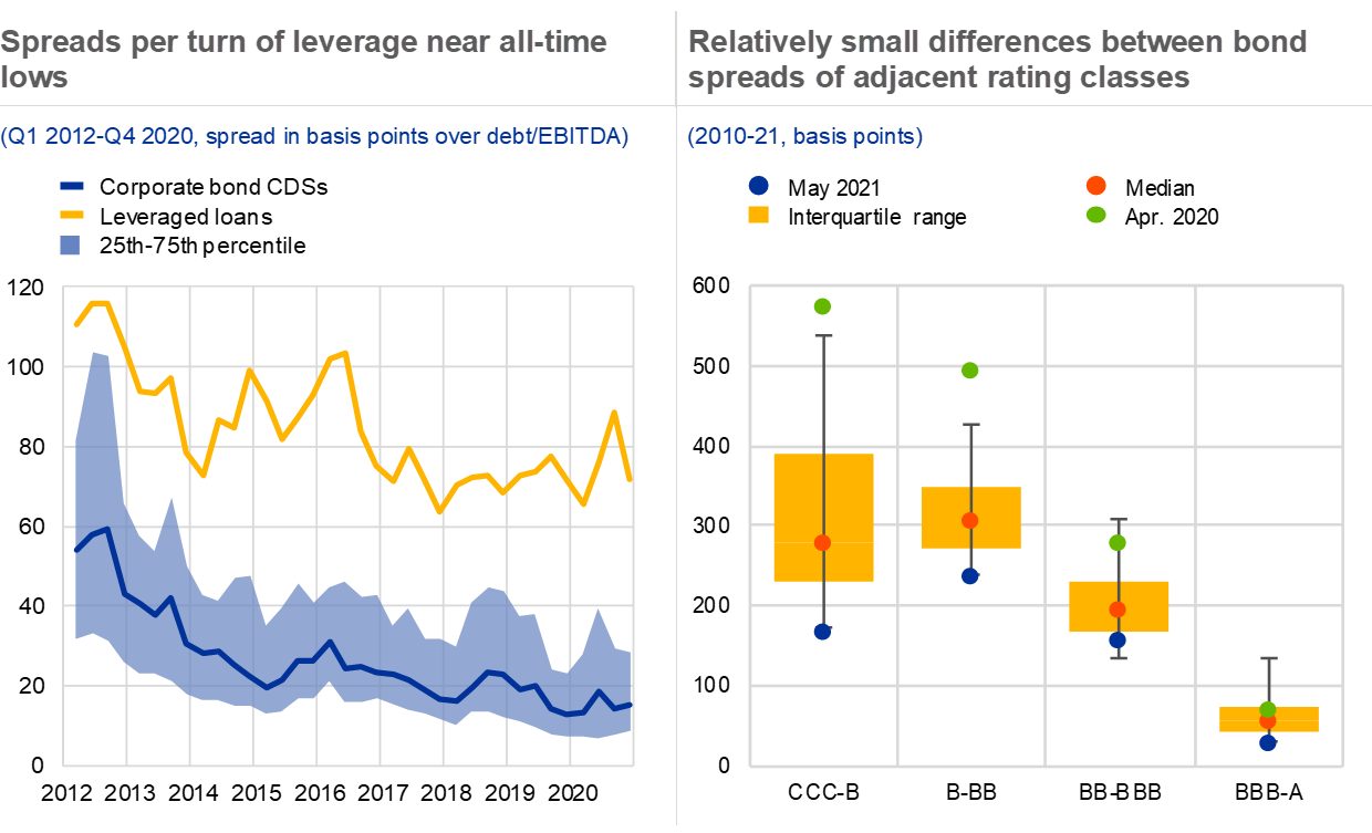 Notes: Left panel: turns of leverage are based on annualised quarterly earnings (EBITDA). CDSs: credit default swaps. Right panel: differences in non-financial corporate spreads between pairs of adjacent rating classes, May 2021 and April 2020 versus historical range. The whiskers represent the historical 5th and 95th percentiles based on daily data since January 2010.