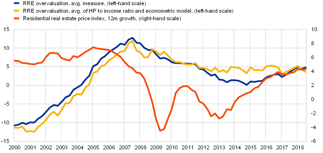 Notes: “RRE overvaluation, avg. measure” stands for the simple average of valuation measures based on price-to-income ratio, price-to-rent ratio, asset pricing approach, and valuation based on the econometric model estimates.