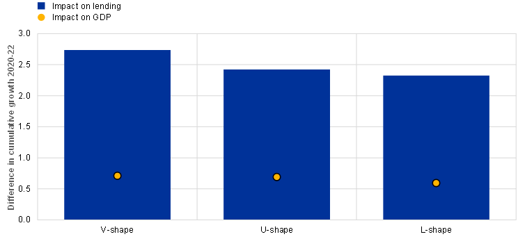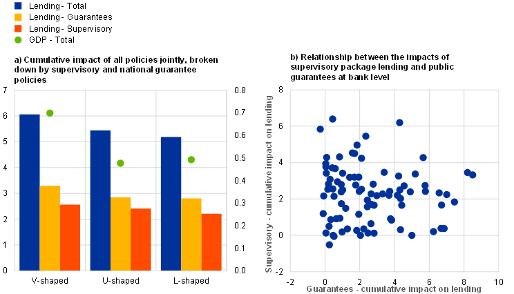 COVID-19 prudential and public-guarantee mitigation policies were best tailored to a relatively short-lasting recession and could have proved insufficient had the recession turned long or deep. The expected cumulated impact of the capital release on lending to the non-financial private sector in the euro area until the end of 2022 was 2.6% in the case of a short-lasting recession (V-shaped) and 2.2% in a deep and long-lasting recession (L-shape). A higher level of available capital, that was not distributed to shareholders due to the binding dividend pay-out restrictions, led to higher lending. In the V-shaped scenario this would have added around 3.3% to the impact of public guarantees and 2.8% in the L-shaped scenario (Chart 2, panel a). Jointly, the policies would have stabilised economic activity measured in GDP terms by 0.7% for the least severe scenario, and by more than 0.5% for the more severe scenario. The impact of supervisory, and government policies would have decreased with the recession severity due to the progressively weaker credit demand outlook. Capital relief and public guarantee programmes primarily sought to prevent credit supply shortages (see Budnik et al. (2021a)).