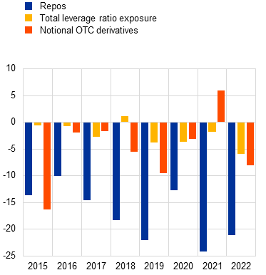 Sizeable variations towards year-end are also observed in the total leverage ratio exposure measure and in the amount of notional over the counter (OTC) derivatives. For the period from 2015 to 2022 the aggregate total leverage ratio exposure measure for 22 EBU banks that reported to the G-SIB assessment was a maximum of €1.1 trillion (or 5.9%) lower at any year-end relative to the preceding quarter. Likewise, over the same period the year-end reductions of notional OTC derivatives amounted to a maximum of €14 trillion (around 16%) of the outstanding amount of any preceding quarters (Chart 2 panels a and b). While repos are included in several indicators of the G-SIB framework and therefore their direct impact on the G-SIB score cannot be easily derived, the total leverage ratio exposure measure and notional OTC derivatives are single indicators receiving weights of 20% and 6.67% respectively in the calculation of the total score.
