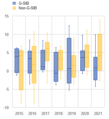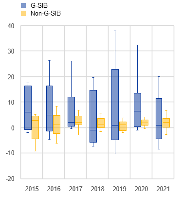 Historical estimated scores at a quarterly frequency suggest that there have been sizeable deviations from EBU banks’ official scores, with larger absolute deviations accounted for by G-SIBs. Since the data reporting to the G‑SIB assessment is only required at an annual frequency, an exact comparison between the official annual G-SIB scores at a higher frequency is not possible. However, quarterly scores can be approximated based on the regular quarterly supervisory data that EBU banks have to submit to the ECB. This strategy has been used in the literature and was repeated for the purpose of this article based on 18 EBU banks for which sufficient data were available.[13] Since quarterly indicator information was not available for the global bank sample, the intra-year denominators were based on the official year-end denominators, adjusted only for the indicator deviations derived from EBU banks’ quarterly indicators. Annual G-SIB scores based on these quarterly data were then derived as the average over the first three quarters of the year, and score deviations were calculated as the approximated G-SIB score minus the official score. The results corroborate the findings of earlier studies. On average, over time and across banks, the estimated G-SIB scores for EBU banks deviate from official scores by 4 basis points for all banks and 7 basis points for eight G-SIBs. However, upward score deviations based on intra-year data can reach substantially larger values (up to 38 basis points) and the maximum over time is, on average, 27 basis points. These figures are largely driven by the G-SIBs – maximum upward deviations for non-GIBs are, on average, around 7 basis points (Chart 3, panel a). By definition, G-SIBs have higher scores than non-G-SIBs and therefore also larger absolute deviations can be observed for G-SIBs. However, calculating score deviations from the total scores in percentage terms reveals that both groups of banks seem to engage in window dressing of a similar magnitude relative to their respective sizes. The percentage score deviations can be as much as 10% of the official year-end G-SIB scores (Chart 3, panel b).