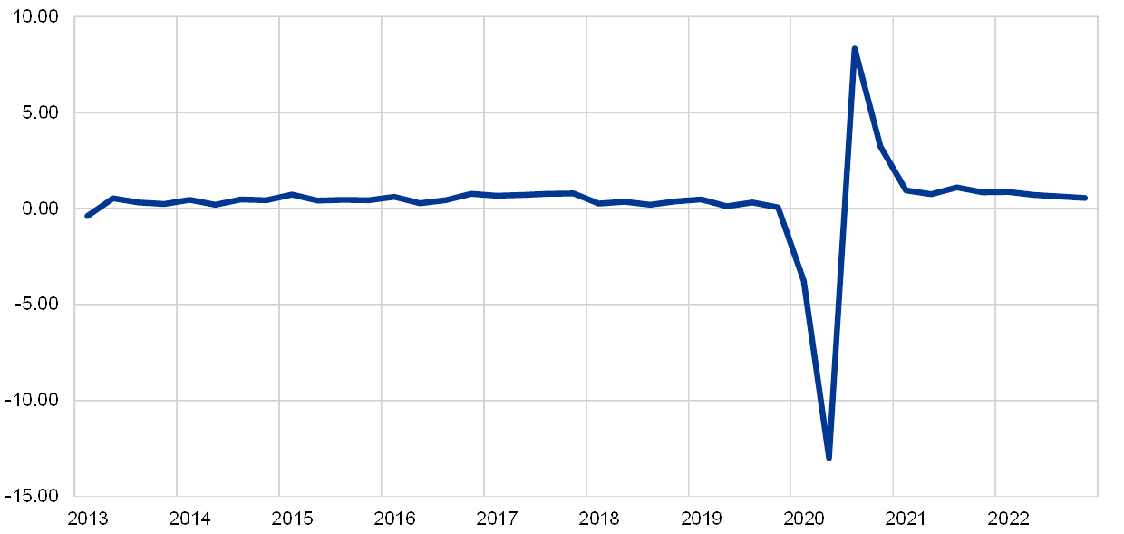 Labour productivity growth is projected to decline in 2020 and then recover over the projection horizon. Given the fiscal measures that cushion the impact on headline employment, labour productivity per person is projected to decline sharply in 2020. There is a differential impact between labour productivity per person employed and labour productivity per hour worked. Productivity per person employed is more adversely affected in 2020, reflecting the large-scale use of short-time working schemes in euro area countries. By contrast, the response in productivity per hour worked is much more muted during the pandemic, as total hours worked are expected to closely follow GDP developments.