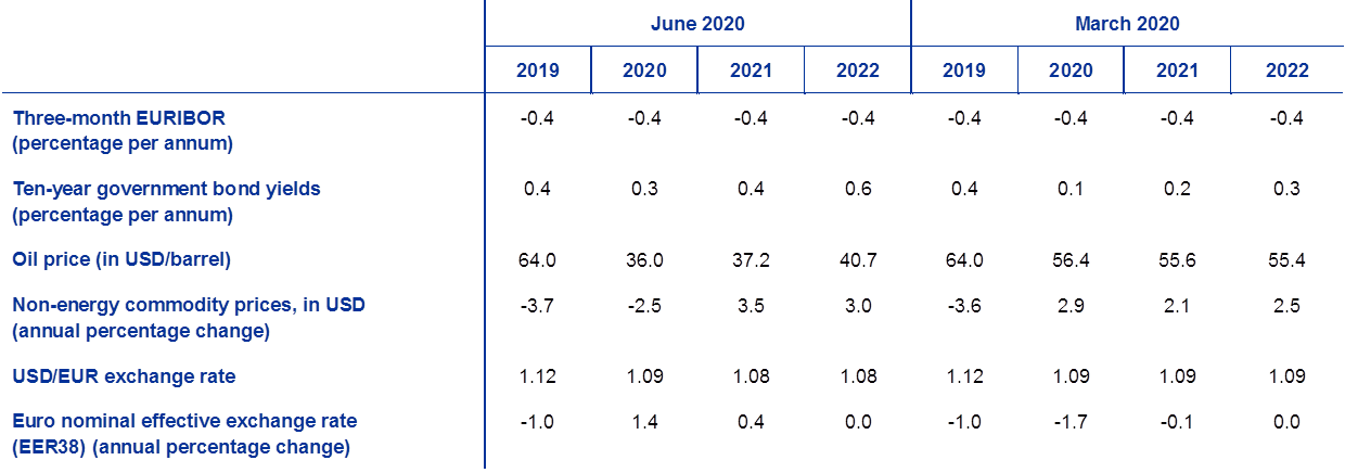 Compared with the March 2020 staff projections, the technical assumptions include significantly lower oil and stock prices, a stronger effective exchange rate of the euro and higher long-term interest rates. The technical assumptions about interest rates and commodity prices are based on market expectations with a cut-off date of 18 May 2020. Short-term interest rates refer to the three-month EURIBOR, with market expectations derived from futures rates. The methodology gives an average level for these short-term interest rates of -0.4% over the entire projection horizon. The market expectations for euro area ten-year nominal government bond yields imply an average level of 0.3% for 2020, 0.4% for 2021 and 0.6% for 2022.[4] Compared with the March 2020 staff projections, market expectations for short-term interest rates remain broadly unchanged, while euro area ten-year nominal government bond yields have been revised up by around 20 basis points for 2020-22.