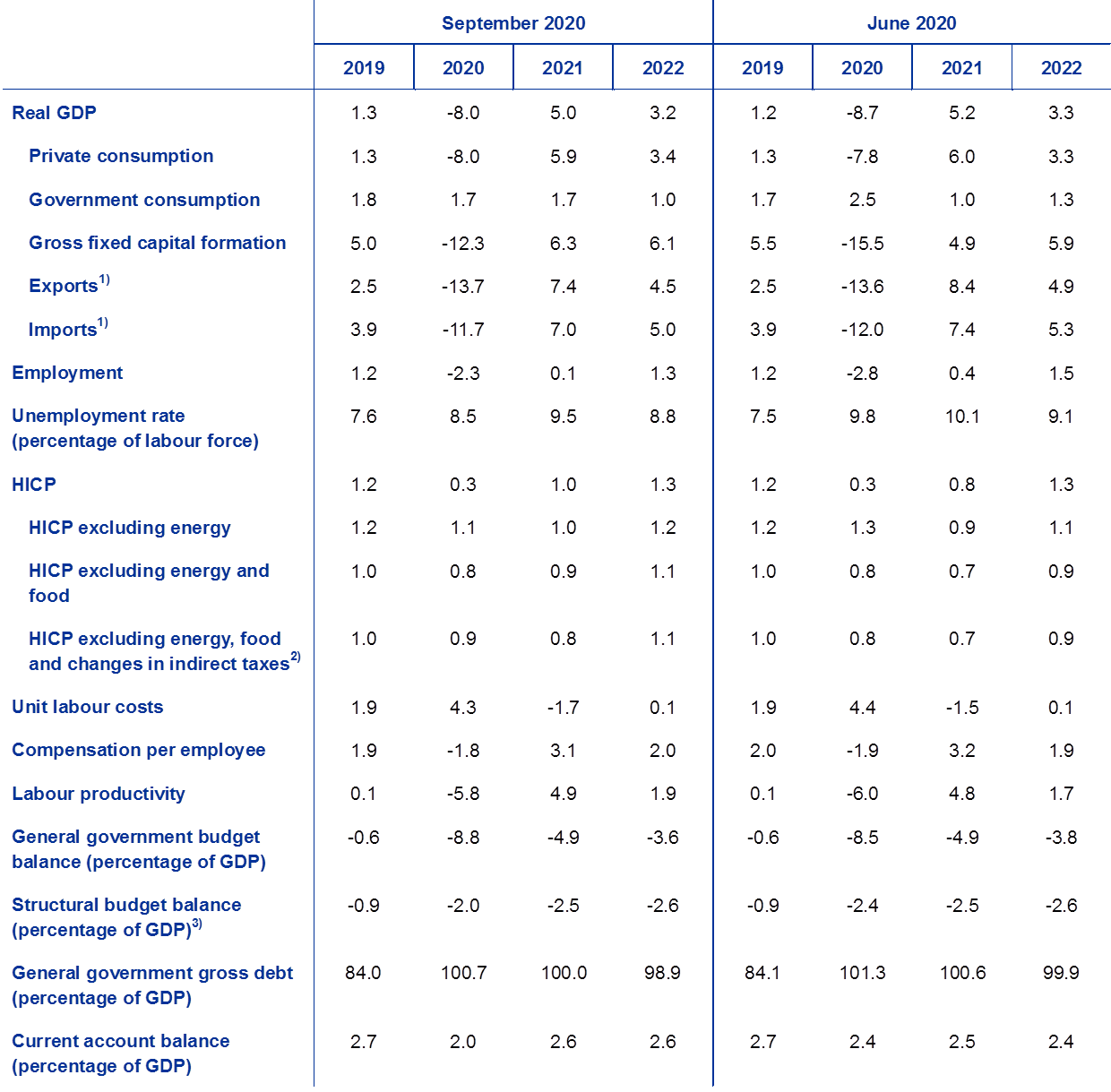 1) The effective exchange rate of the euro used in the September 2020 ECB staff projections refers to 42 trading partners compared to 38 trading partners used in the June 2020 Eurosystem staff projections.
