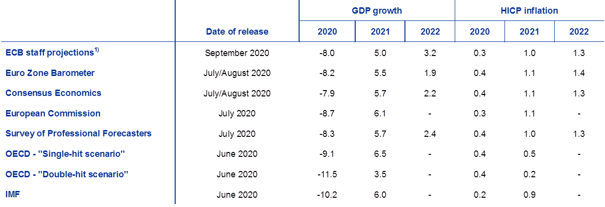 Sources: MJEconomics for the Euro Zone Barometer, 17 August 2020, data for the year 2022 is taken from the July 2020 survey; Consensus Economics Forecasts, 14 August 2020, data for the year 2022 is taken from the July 2020 survey; European Commission Summer 2020 (Interim) Economic Forecast; ECB Survey of Professional Forecasters, 2020Q3, conducted between 30 June and 6 July 2020; OECD June 2020 Economic Outlook 107. Double-hit scenario refers to one in which a second less intensive wave of the virus breaks out in 2020Q4, while in the "single-hit" scenario containment measures successfully overcome the current outbreak. The table includes both scenarios as the OECD puts equal weight on the two without defining a single baseline; IMF World Economic Outlook, 24 June 2020.