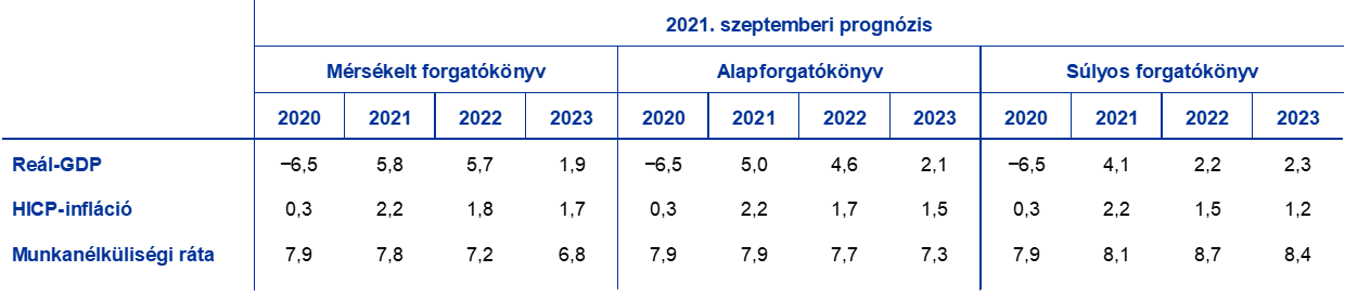 Annak ellenére, hogy a HICP-infláció rövid távon csaknem azonos a kétféle forgatókönyvben, 2023-ban 1,7%-ra, illetve 1,2%-ra csökken a mérsékelt, illetve a súlyos forgatókönyvek szerint. Ez annak tudható be, hogy az infláció megemelkedésének fő mozgatórugói rövid távon mindkét forgatókönyvre egyaránt érvényesek, ugyanakkor középtávon a forgatókönyvek közötti HICP-eltérések főként az eltérő reálgazdasági helyzetet, és különösen a súlyos forgatókönyv szerint érvényesülő, jelentősen nagyobb kihasználatlan kapacitásokat tükrözi.