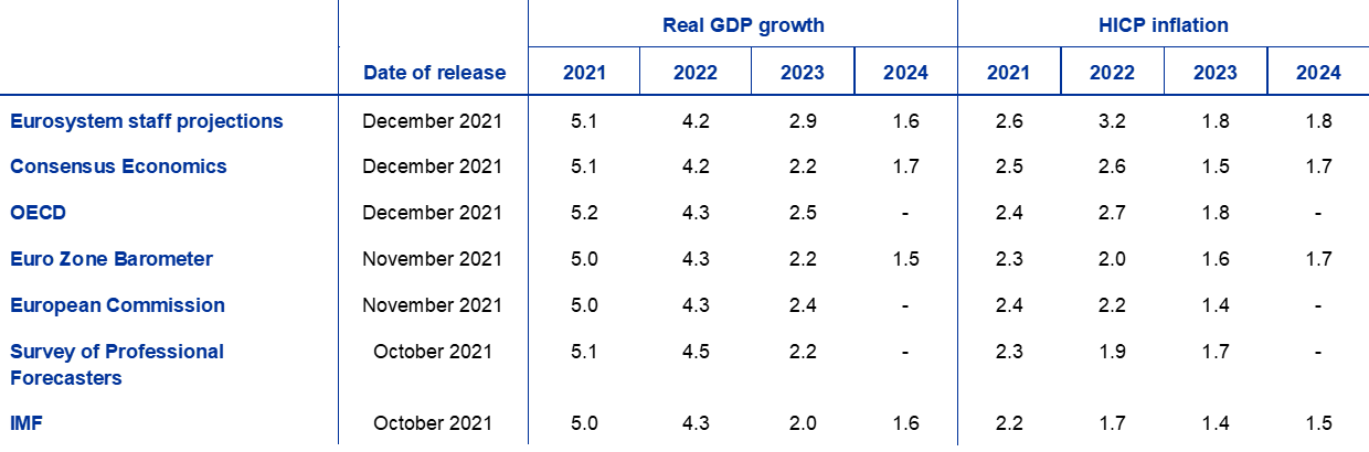 Sources: Consensus Economics Forecasts, 9 December 2021, data for 2023 and 2024 are taken from the October 2021 survey; OECD December 2021 Economic Outlook 110; MJEconomics for the Euro Zone Barometer, 18 November 2021, data for 2023 and 2024 are taken from the October 2021 survey; European Commission Autumn 2021 Economic Forecast; ECB Survey of Professional Forecasters, for the fourth quarter of 2021, conducted between 1 and 11 October; IMF World Economic Outlook, 12 October 2021.