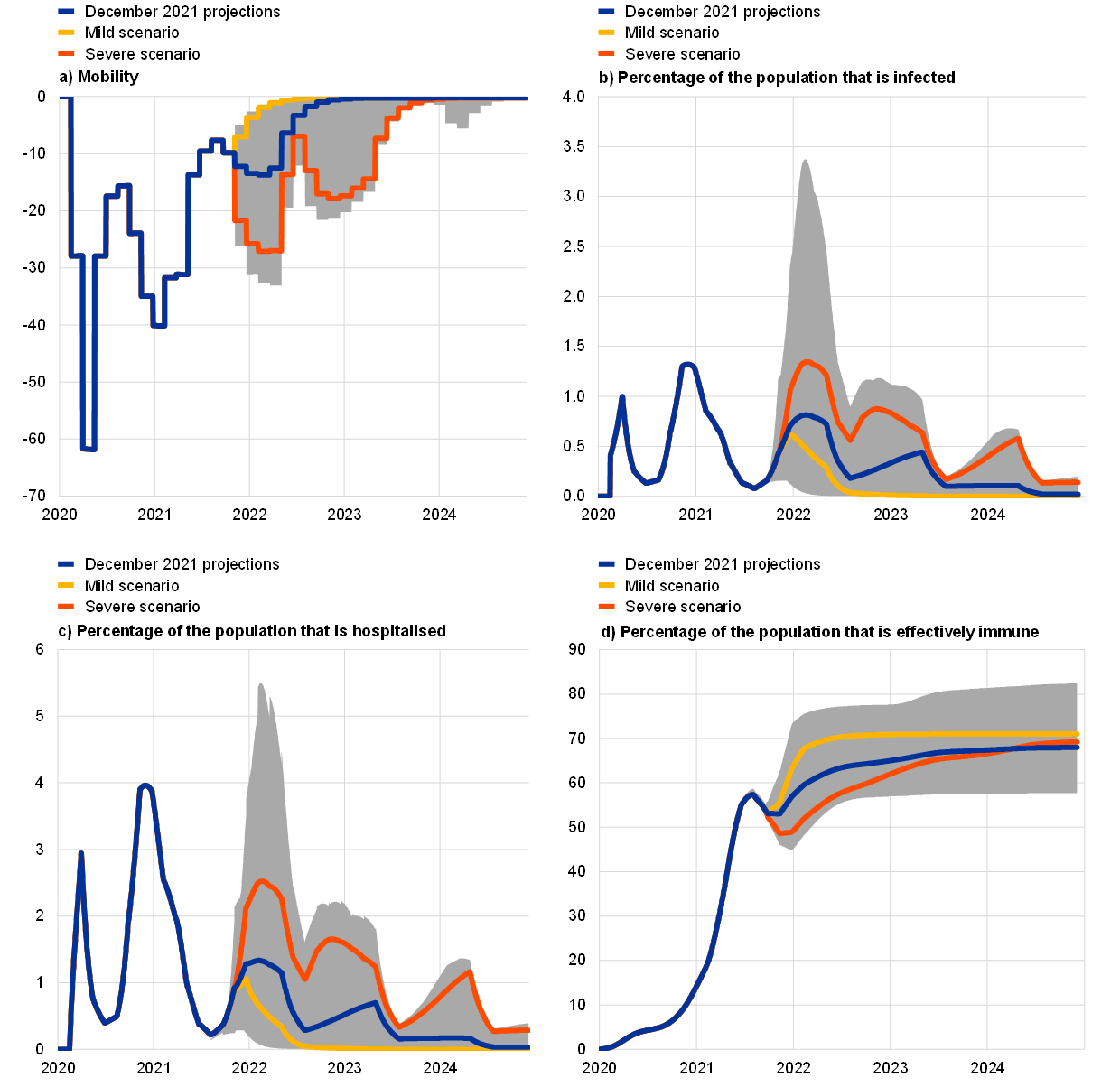 As significant uncertainty about the future evolution of the pandemic and its economic consequences persists, as highlighted by the new Omicron variant, this box presents two alternative scenarios around the December 2021 baseline.[13] Compared with the baseline, a mild scenario envisages a faster resolution of the pandemic in the course of 2022 – especially in emerging market economies on account of assumed faster vaccination rates. Under this scenario, infection rates would be lower, the effectiveness of vaccines would be higher and reinfection risks would be lower (Chart A). This would expedite the loosening of restrictions, inducing strong positive confidence effects and leading to very limited economic costs. In contrast, the severe scenario envisages a prolonged health crisis characterised by recurrent pandemic waves (with new virus variants, a risk highlighted by the emergence of the Omicron variant) and a lower proportion of the population being effectively protected. The ensuing strong resurgence in infections and hospitalisations is foreseen to induce a tightening of restrictions on mobility and hence economic activity in early 2022, albeit to a smaller degree than in early 2021. The health crisis is assumed to continue until mid-2023, thus dampening activity and resulting in economic scarring, amplified by increased insolvencies.