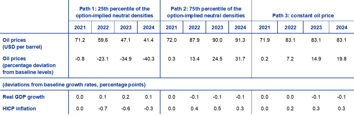 This sensitivity analysis aims to assess the implications of alternative oil price paths. The technical assumptions for oil price developments are based on oil futures. Several alternative paths of the oil price are analysed. The first is based on the 25th percentile of the distribution provided by the option-implied densities for the oil price on 25 November 2021, which is the cut-off date for the technical assumptions. This path implies a gradual decrease in the oil price to about 40% below the baseline assumption for 2024. Using the average of the results from a number of staff macroeconomic models, this path would have a small upward impact on real GDP growth and a more pronounced downward impact on HICP inflation throughout the projection horizon. The second path is based on the 75th percentile of the same distribution and implies an increase in the oil price to around 32% above the baseline assumption for 2024. This path would have a very small downward impact on real GDP growth and a somewhat stronger upward impact on HICP inflation in 2022-24. The third path is based on the assumption that the oil price remains at its level on the cut-off date of USD 83.1 per barrel, which by 2024 is around 20% higher than the baseline assumption for that year. This path would have a marginal downward impact on real GDP growth in 2023-24, while HICP inflation would be 0.2-0.3 percentage points higher in 2022-24.