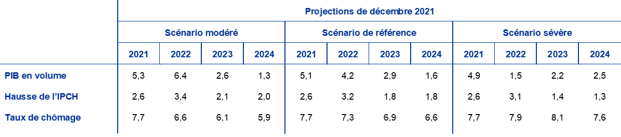 La croissance économique devrait rester soutenue au cours des trois prochaines années, malgré certains vents contraires à court terme[1]. La forte hausse des taux d’infection au coronavirus (COVID-19) dans plusieurs pays de la zone euro a entraîné de nouvelles restrictions et un accroissement des incertitudes quant à la durée de la pandémie. L’apparition du variant Omicron est venue s’ajouter à ces incertitudes[2]. De plus, les goulets d’étranglement du côté de l’offre se sont intensifiés et devraient persister plus longuement que prévu, leur dissipation progressive n’étant projetée qu’à partir du second trimestre 2022, avec une résorption complète d’ici 2023. Le PIB en volume devrait désormais dépasser son niveau d’avant la crise au premier trimestre 2022, soit un trimestre plus tard qu’anticipé dans les projections de septembre 2021. Néanmoins, avec l’atténuation des tensions mondiales sur l’offre, l’allègement des restrictions sanitaires, la diminution de l’incertitude associée et le ralentissement de l’inflation partant de niveaux élevés, la croissance devrait s’accélérer à nouveau à compter de la mi-2022, malgré une orientation budgétaire moins favorable et des anticipations de taux de marché plus élevés. La consommation privée restera le principal moteur de la croissance économique, bénéficiant d’un rebond du revenu réel disponible, de la résorption d’une partie de l’épargne accumulée et de la bonne santé du marché du travail, le taux de chômage s’établissant, à la fin de l’horizon de projection, à un niveau qui n’a jamais été aussi bas depuis la création de la zone euro, en 1999. Par rapport aux projections de septembre 2021, l’intensification des goulets d’étranglement mondiaux au niveau de l’offre et le durcissement des restrictions sanitaires ont provoqué une révision à la baisse de la croissance à court terme. Cela étant, la dissipation graduelle de ces facteurs devrait soutenir un rebond plus net à compter du deuxième trimestre 2022, grâce auquel le PIB en volume dépasserait le niveau anticipé dans les projections de septembre 2021 d’ici la fin 2022, les effets de report associés se traduisant par une importante révision à la hausse de la croissance annuelle en 2023.