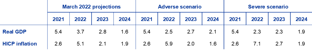 On account of the significant uncertainty surrounding the impact of the conflict in Ukraine on the euro area economy, in addition to the baseline, two scenarios have been prepared. Compared with the baseline, an “adverse” scenario assumes that stricter sanctions are imposed on Russia, leading to some disruptions in global value chains. Persistent cuts in Russian gas supplies would lead to higher energy costs and to cuts in euro area production, but this would be only temporary as substitution into other energy sources takes place. In addition, geopolitical tensions would be more sustained than in the baseline, leading to additional financial disruptions and more persistent uncertainty. Under such a scenario, euro area GDP growth would be 1.2 percentage points lower than the baseline in 2022, while inflation would be 0.8 percentage points higher. Differences would be more limited in 2023. In 2024, growth would be somewhat stronger than the baseline as the economy catches up after the larger negative impact on economic activity in 2022 and 2023. As oil and gas markets rebalance, the large spikes in energy prices would gradually unwind, causing inflation to decline below the baseline, especially in 2024. A more “severe” scenario includes, in addition to the features of the adverse scenario, a stronger reaction of energy prices to more stringent cuts in supply, stronger repricing in financial markets and larger second-round effects from rising energy prices. This scenario would imply GDP growth in 2022 that is 1.4 percentage points below the baseline, while inflation would be 2.0 percentage points higher. Significantly lower growth and higher inflation, compared with the baseline, would also be seen in 2023. Higher persistence of the disruptions triggered by the war imply that, in 2024, the catch-up effects on growth would be relatively modest whereas stronger second-round effects would offset the negative impact on inflation from declining energy prices.