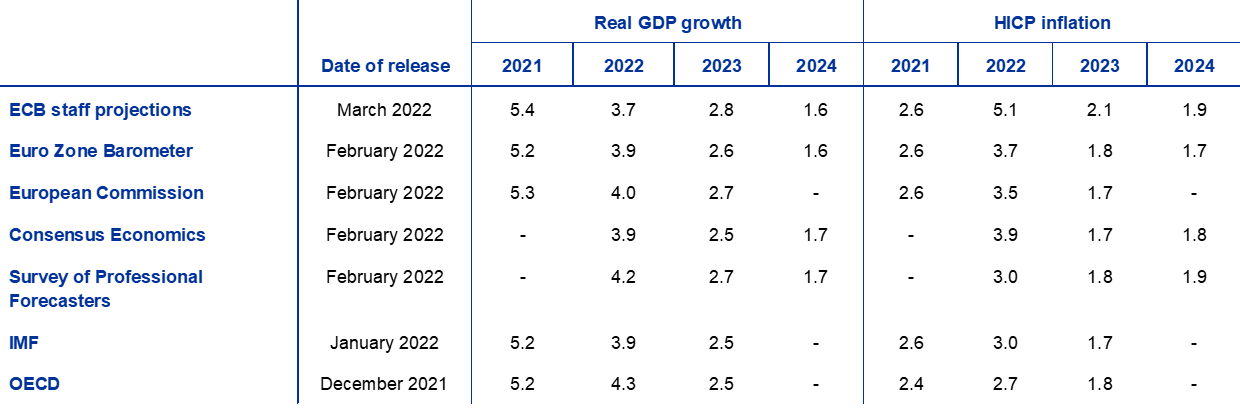 The March 2022 ECB staff projections are below those of other forecasters for growth in 2022, while for inflation in 2022 they are well above other forecasts, owing to the inclusion of the impact of the conflict in Ukraine and more recent data. For the outer years of the horizon, the differences are more limited. Despite the downward revision compared with the December 2021 Eurosystem staff projection for growth in 2022, the March 2022 ECB staff projection is only slightly below other more recent projections for 2022 and is still somewhat above other forecasts for 2023. As regards inflation, the ECB staff projection is far higher than the other forecasts for 2022 owing to the more recent cut-off date, which made it possible to include the February 2022 HICP flash estimate and more up-to-date technical assumptions following the Russian invasion of Ukraine. For 2024, the ECB staff projections are within a much narrower range of other forecasts for both growth and inflation.