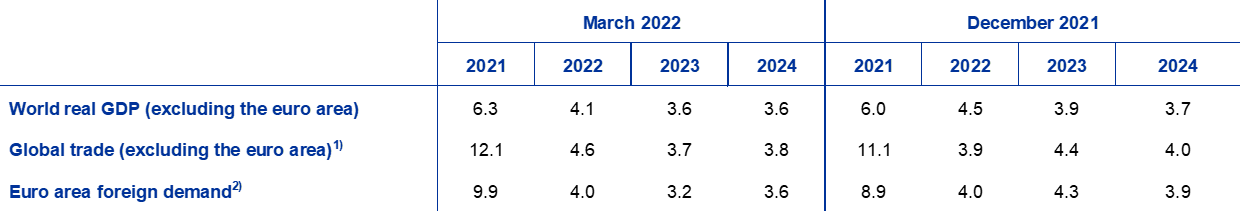 After buoyant growth in 2021, growth in euro area foreign demand is projected to normalise gradually over the projection horizon. In the second half of 2021 global trade turned out stronger than expected, notwithstanding supply chain disruptions, driven by robust developments in emerging Asia (mainly China and India) and, in the fourth quarter, the United States. Survey data point to rather subdued trade growth at the turn of the year, partly on account of the resurgence of the pandemic, but this is expected to be temporary. For 2022, a positive carry-over effect more than offsets the weaker dynamics stemming from the revisions to global activity and the adverse effects of the conflict in Ukraine, which results in a significant upward revision to growth in global imports for 2022 compared with the December 2021 projections. Euro area foreign demand is unrevised for 2022, since the strong positive carry-over effect is fully offset by weaker trade on account of the conflict in Ukraine, while it is revised down for 2023 and 2024 (-1.1 percentage points and -0.3 percentage points respectively).