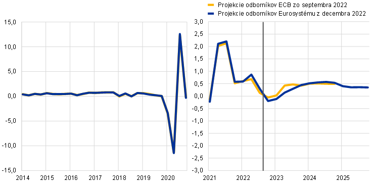 Poznámky: Historické údaje sa môžu líšiť od najnovších publikácií Eurostatu vydaných po uzávierke projekcií (poznámka pod čiarou 1). Zvislá čiara označuje začiatok aktuálne projektovaného obdobia.