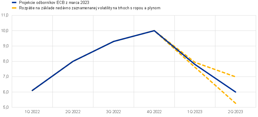 Podľa alternatívneho vývoja cien ropy a plynu vychádzajúceho z aktuálnych údajov by sa mohol krátkodobý výhľad vývoja inflácie HICP v druhom štvrťroku 2023 pohybovať v rozpätí od 5,3 % do 7,0 %. Výrazná krátkodobá volatilita, ktorú pozorujeme posledný rok, zvyčajne nie je zachytená v distribúcii odvodenej z opcií okolo cien futures (viac informácií nižšie). Pri posudzovaní takejto krátkodobej citlivosti je možné prihliadať na hornú a dolnú hranicu krátkodobých výkyvov cien ropy a plynu a následne na základe tohto intervalu odvodiť prognózy vývoja inflácie v blízkej budúcnosti. V tejto analýze citlivosti je pre ropu stanovený interval od 55 USD do 125 USD za barel a pre veľkoobchodné ceny plynu interval od 20 € do 150 € za MWh. Tieto ceny, ktoré sa považujú za stabilné v období od marca 2023 do júna 2023, sa zadávajú do súboru energetických rovníc (pre pohonné hmoty, elektrinu a plyn), ktoré odborníci ECB používajú pri prognózovaní krátkodobej inflácie. Predpokladaný maximálny rast cien ropy a plynu by v porovnaní so základnými projekciami celkovú infláciu HICP v prvom štvrťroku 2023 zvýšil o 0,1 percentuálneho bodu a v druhom štvrťroku 2023 o 1,0 percentuálneho bodu. Predpokladaný maximálny pokles cien ropy a plynu by celkovú infláciu v prvom štvrťroku 2023 znížil o 0,2 percentuálneho bodu a v druhom štvrťroku 2023 o 0,7 percentuálneho bodu.