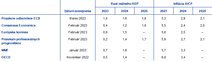 Zdroj: Consensus Economics Forecasts, 16. február 2023 (údaje za rok 2025 pochádzajú z prieskumu z januára 2023); Zimná predbežná hospodárska prognóza Európskej komisie, 13. február 2023; Prieskum profesionálnych prognostikov ECB, 3. február 2023; Aktualizovaný svetový hospodársky výhľad MMF, 30. január 2023; Hospodársky výhľad OECD, 112, 22. november 2022.