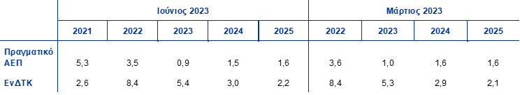 Σε σύγκριση με τις προβολές του Μαρτίου 2023, ο ρυθμός αύξησης του πραγματικού ΑΕΠ έχει αναθεωρηθεί προς τα κάτω κατά 0,1 ποσ. μον. για το 2023 και το 2024, αλλά παραμένει αμετάβλητος για το 2025. Η αυστηροποίηση των συνθηκών προσφοράς πιστώσεων εκτιμάται ότι θα επηρεάσει κάπως περισσότερο αρνητικά την ανάπτυξη το 2023 σε σχέση με τις υποθέσεις των προβολών του Μαρτίου 2023, ενώ οι επιδράσεις για την περίοδο 2024-25 παραμένουν σε γενικές γραμμές αμετάβλητες. Η συμβολή των αποθεμάτων αναμένεται επίσης, βάσει των υποθέσεων, να είναι ασθενέστερη το 2023, σε σύγκριση με τις προβολές του Μαρτίου. Πέραν του βραχυπρόθεσμου ορίζοντα, η ασθενέστερη συμβολή των καθαρών εξαγωγών, ιδίως το 2024, φαίνεται ότι θα αντισταθμιστεί από την ενίσχυση της εγχώριας ζήτησης που θα υποστηριχθεί από την εντονότερη αύξηση του πραγματικού διαθέσιμου εισοδήματος και την υποχώρηση της αβεβαιότητας.